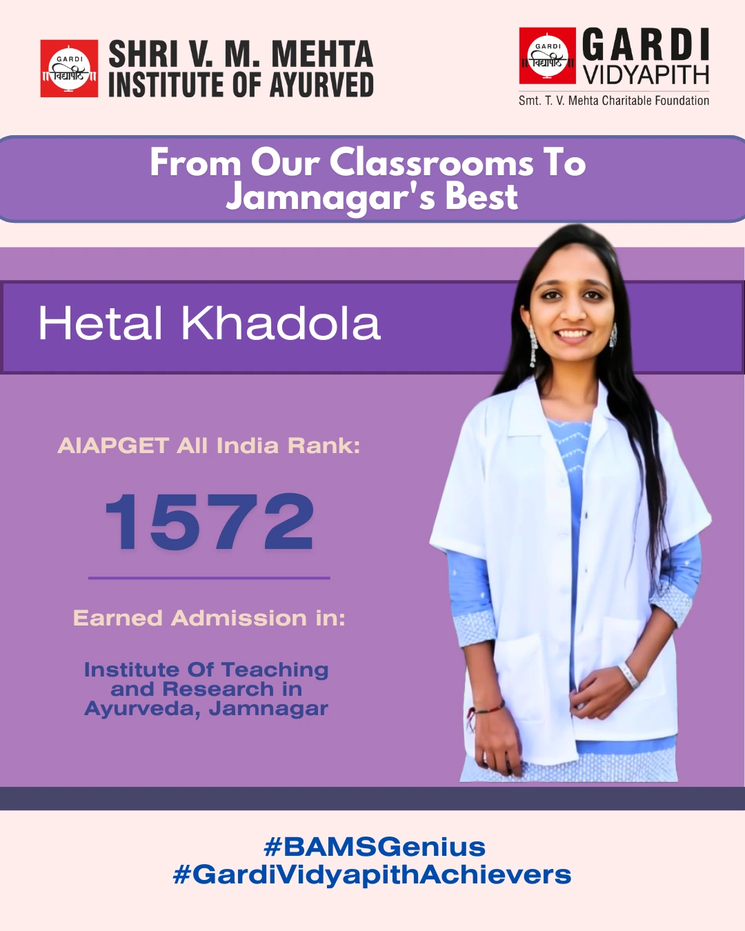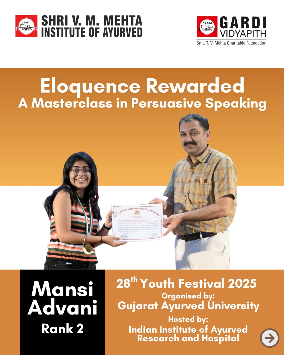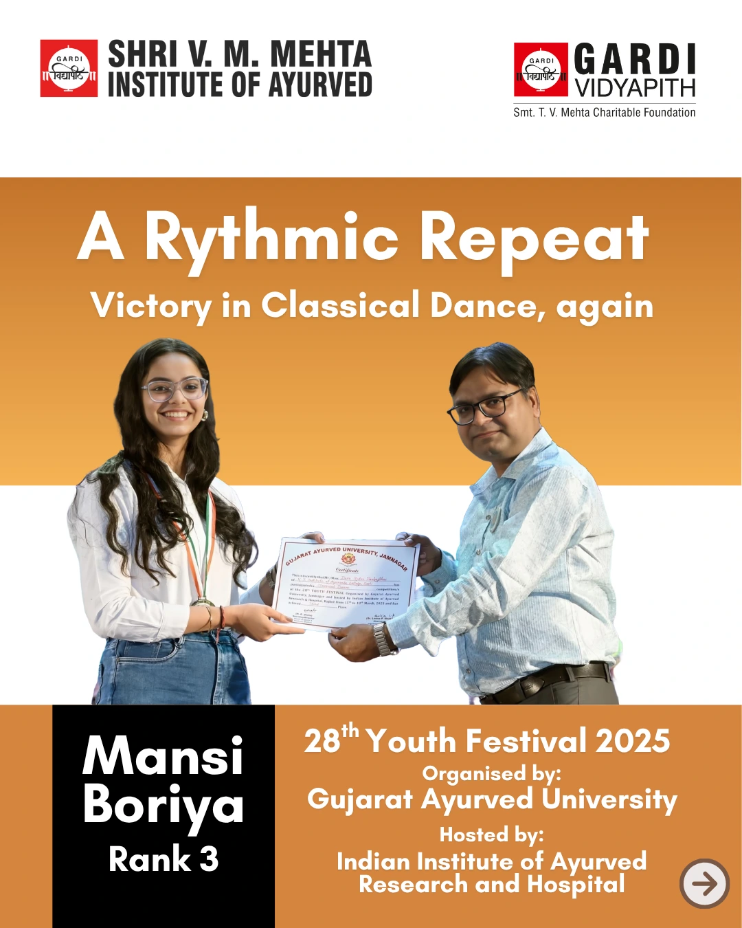 Shri V M Mehta Institute of Ayurved is one of the pioneering and reputed Ayurved colleges in the Saurashtra region of Gujarat, established in 2015. The institute offers well-equipped infrastructure, a fully functional hospital, and an in-house pharmacy to provide comprehensive academic and clinical training. With 14 well-established departments functioning as per NCISM, New Delhi norms, the institute nurtures students into skilled Vaidyas (doctors) grounded in authentic Ayurvedic knowledge and practice.Guided by experienced and highly qualified faculty, students receive quality education along with strong clinical exposure. The institute also provides excellent residential facilities within a safe and supportive campus environment. It is affiliated with Gujarat Ayurved University, Jamnagar, and approved by NCISM, New Delhi.