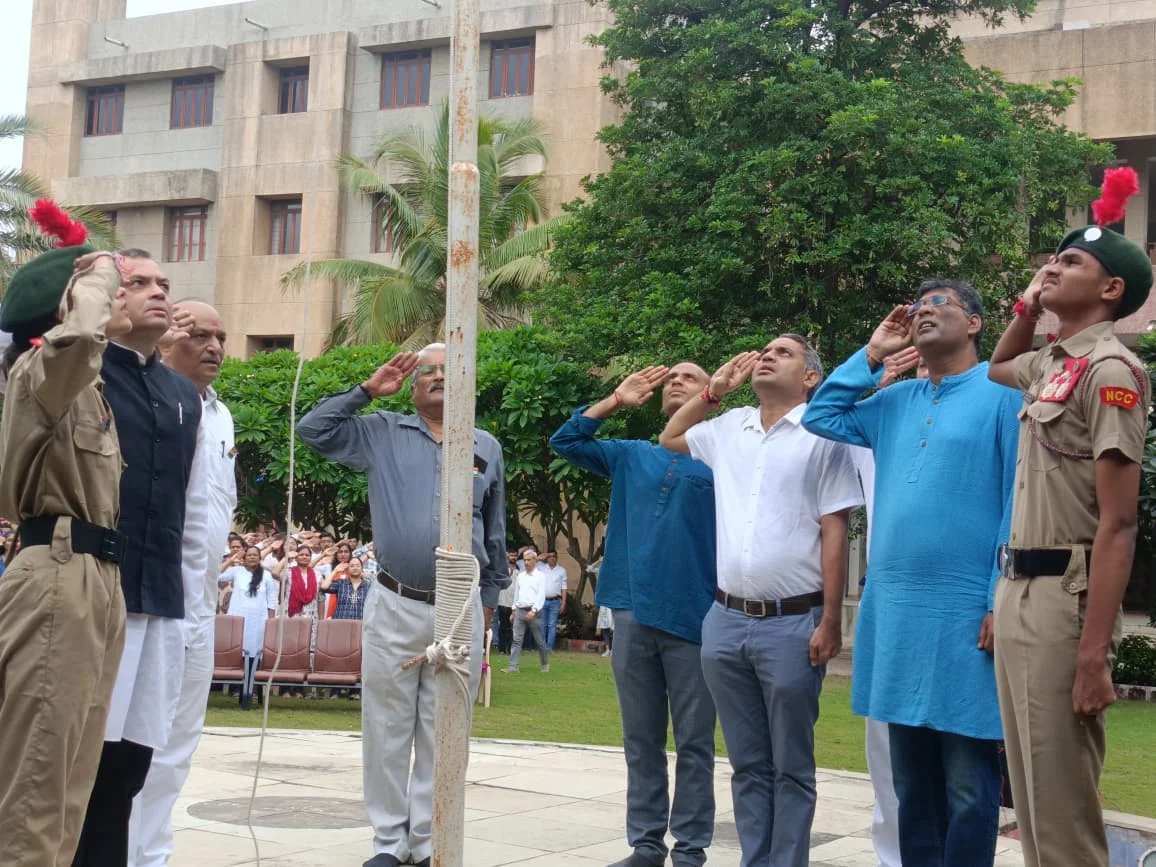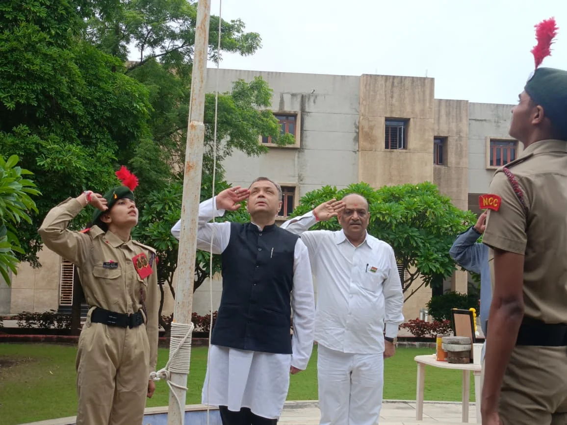 On 15th August 2025, B.H. Gardi College proudly celebrated the 79th Independence Day of India with great enthusiasm and patriotism. The celebration commenced at 9:30 AM with the flag hoisting ceremony by the Chief Guest, Dr. J. M. Badiyani, followed by the singing of the National Anthem, which filled the campus with a spirit of unity and pride.