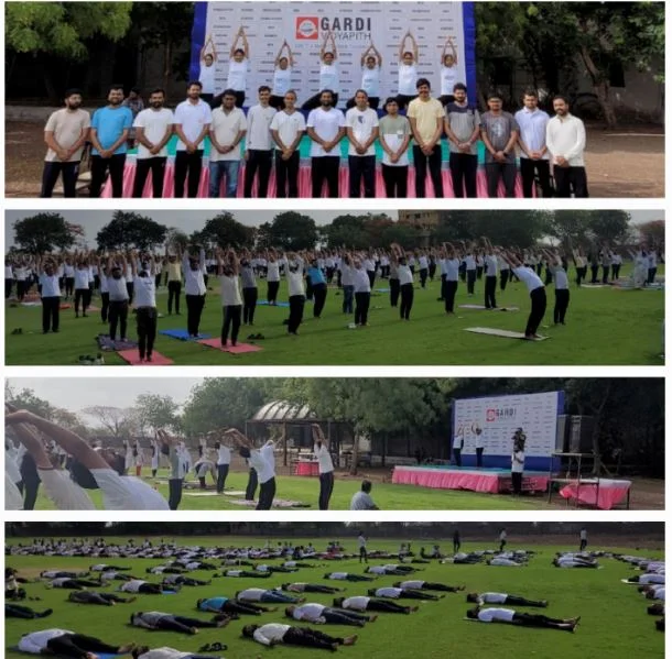 Gardi Vidyapeeth celebrated the 10th International Yoga Day on 21st June 2024 from 7:30 AM to 9:30 AM with great enthusiasm. The event saw active participation from respected Trustee Jay Mehta Sir, Principals, Vice Principals, faculty, staff, and students of all institutes under the Gardi Vidyapeeth banner. A large crowd gathered on the ground, all dressed in a coordinated white and black dress code, creating a visually serene and unified atmosphere. The session featured guided yoga practices promoting physical and mental well-being, reflecting the shared commitment to a healthier and more mindful lifestyle.